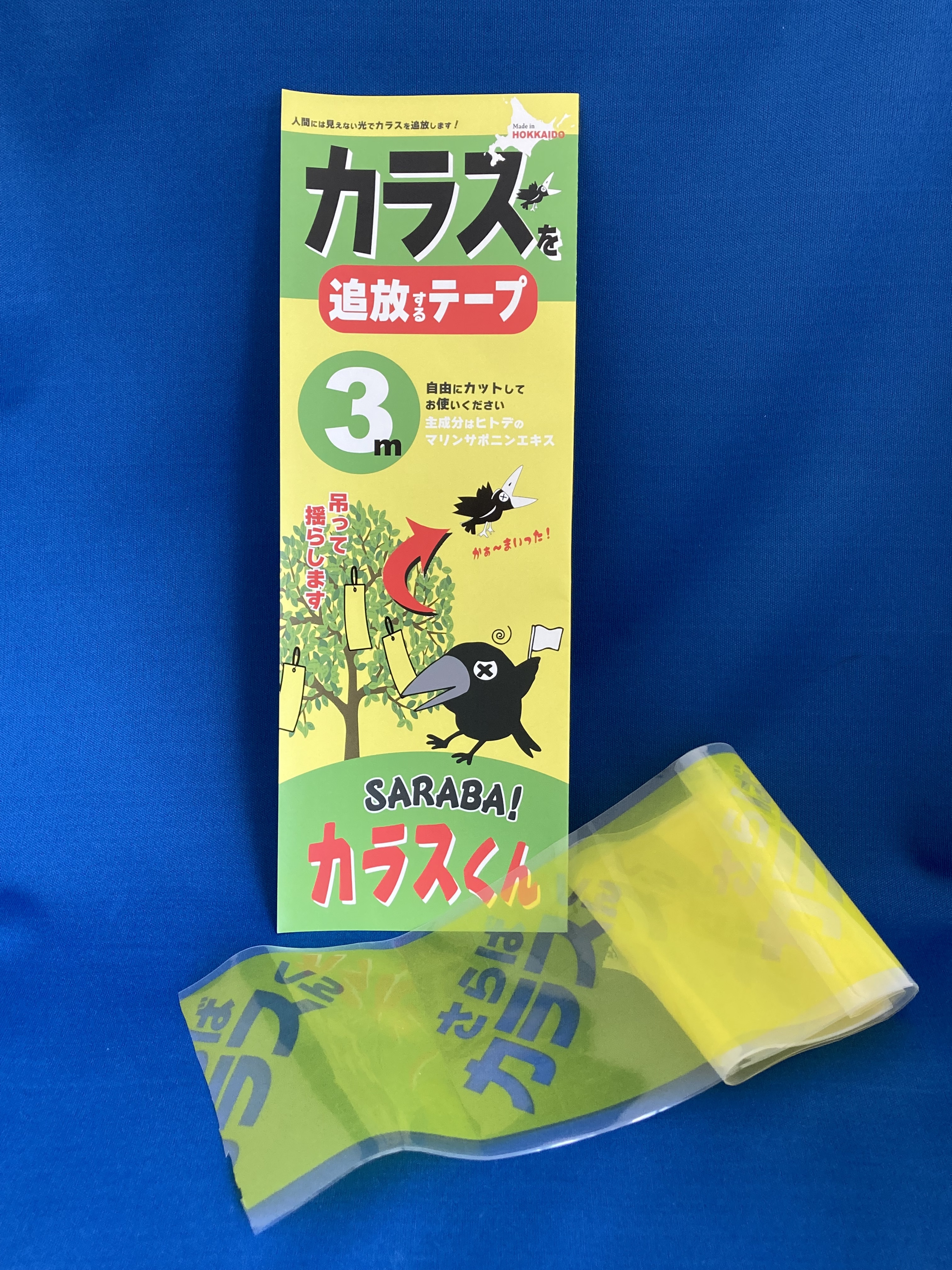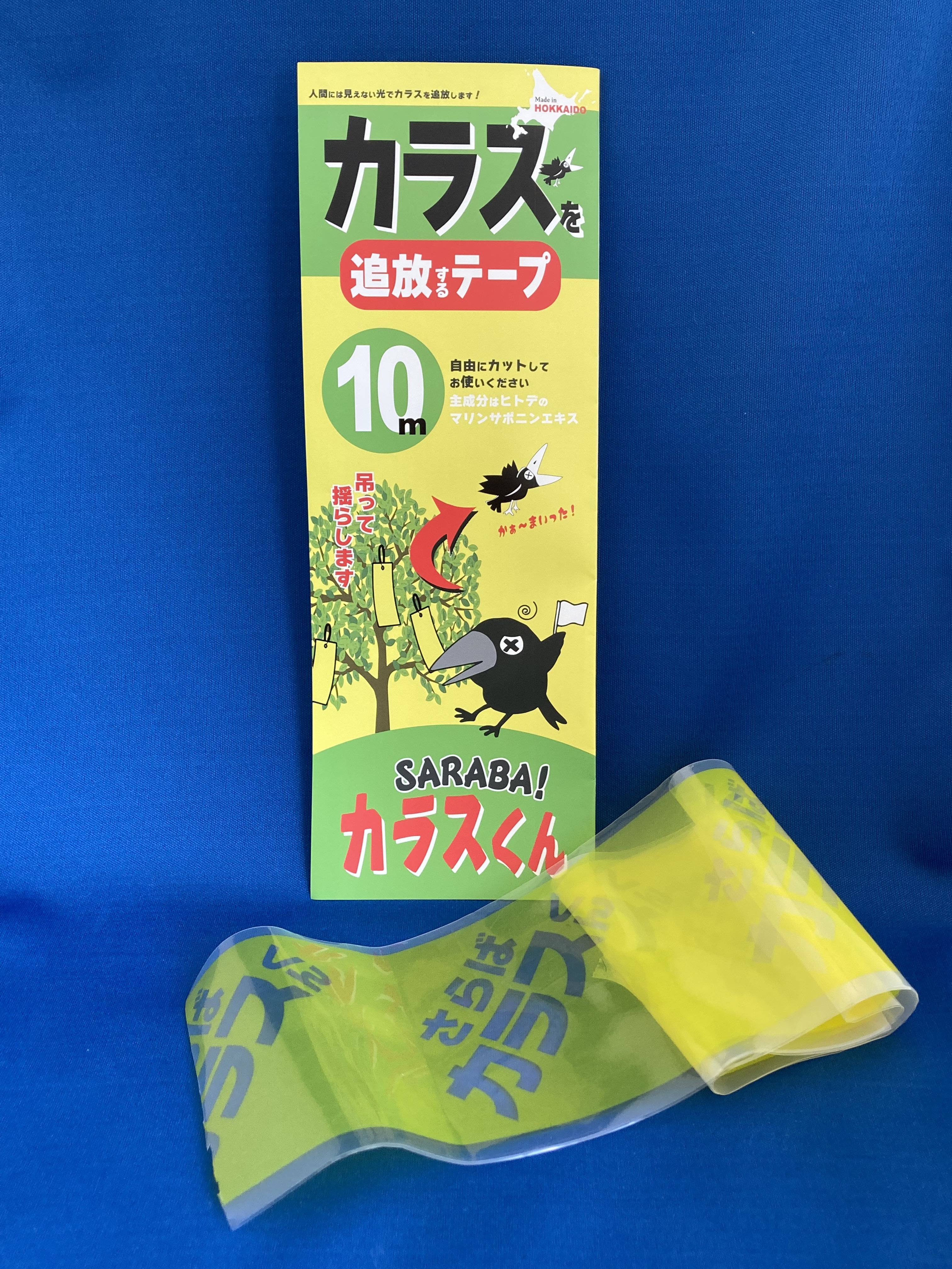 弊社が開発した100mロールテープは、カラスの畑侵入を防ぐ忌避テープで、カラスの嫌がる成分をテープの黄色いインキの中に閉じ込めています。