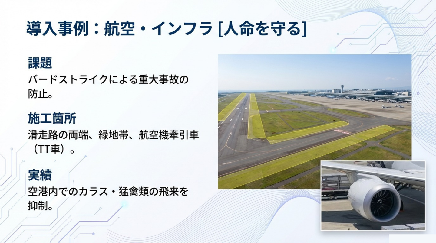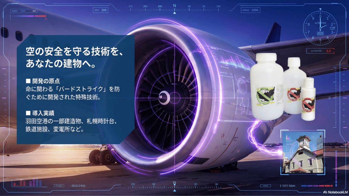 一歩間違えれば重大事故に繋がる、飛行機と鳥の衝突(バードストライク)。その防止策として、空港内の建物や車両に実際に採用されているプロ仕様の忌避塗料です。