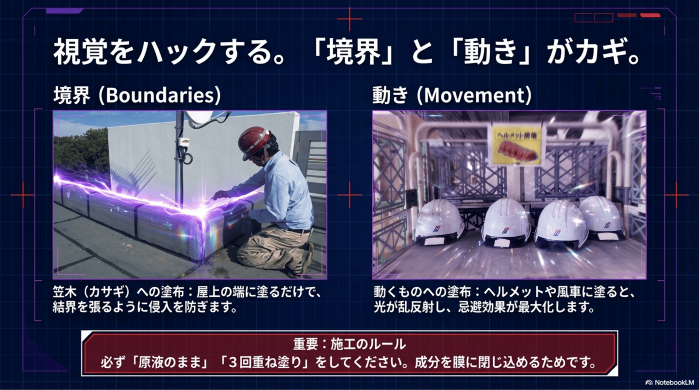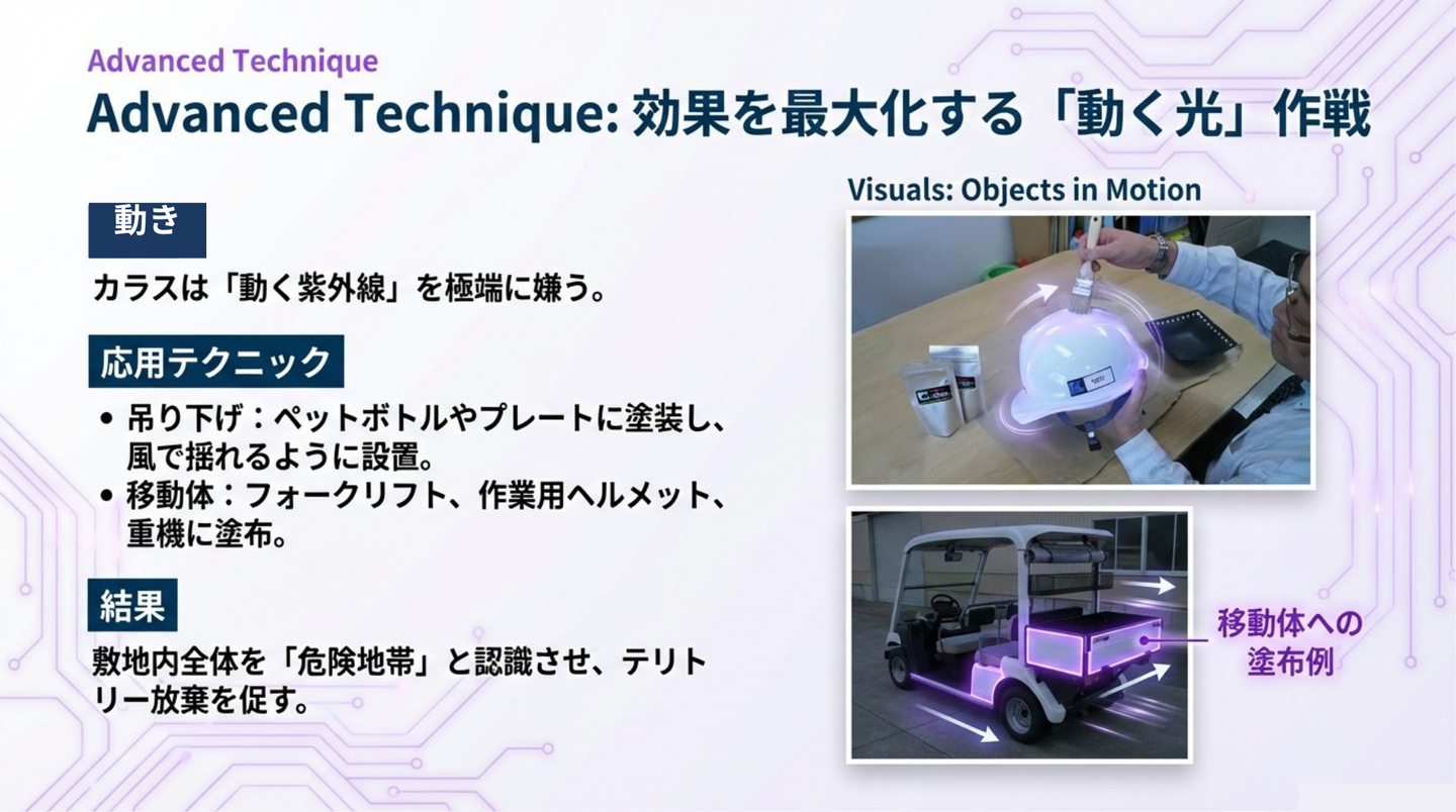 人間には透明で見えませんが、視力の良いカラスやトンビには「強烈に嫌な光」として認識されます。彼らの優れた視覚を逆手に取り、近寄る気を失わせます。