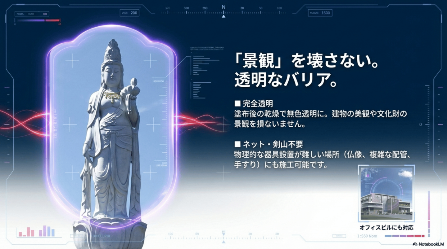 水溶性塗料なので、ヘルメットや手すり、車両など、どこでも塗るだけ。透明タイプなので、建物の見た目を変えることなく、約1年にわたって、高い忌避効果を発揮します。