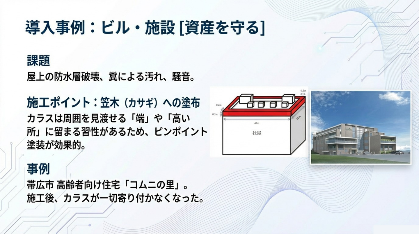 水産加工場や食品工場の屋上では、カラスが笠木に止まってフンを撒き散らすため、衛生面での問題解決に最適。